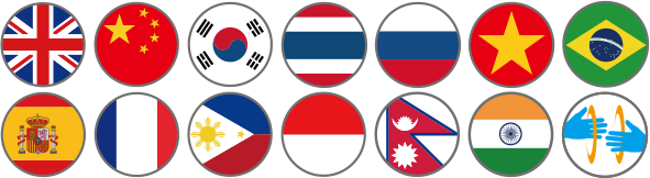 対応言語は英語・中国語・韓国語・タイ語・ロシア語・ベトナム語・タガログ語・ポルトガル語・スペイン語・フランス語・ネパール語・ヒンディー語・インドネシア語の13ヶ国語で訪日外国人の約96%をカバーしています。