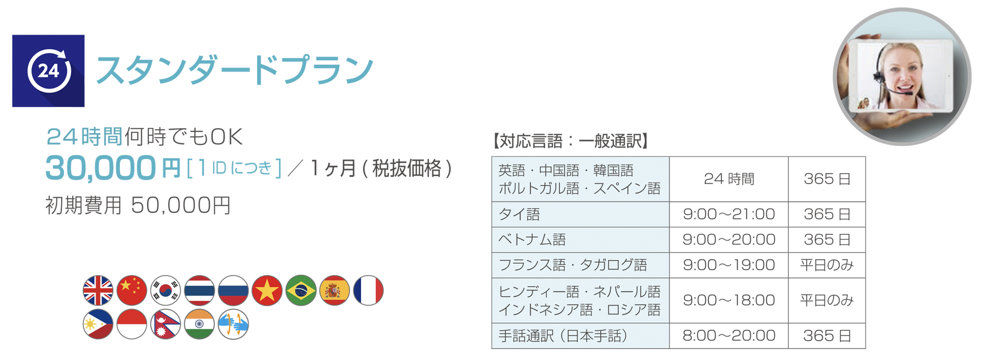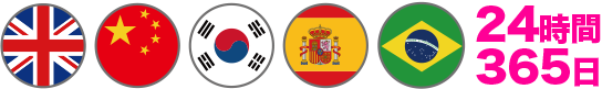 英語・中国語・韓国語・スペイン語・ポルトガル語は、24時間365日対応しています。