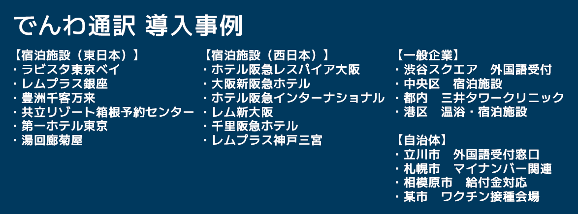コールセンター(国内12箇所)に待機する通訳オペレーターを、オンラインでタブレットやスマホなどに呼び出すサービスです。